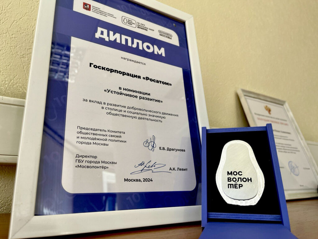 Госкорпорация «Росатом» получила награду ресурсного центра добровольчества «Мосволонтер». Она получена с формулировкой «за вклад в развитие добровольческого движения в Москве и социально значимую общественную деятельность». Церемония награждения партнеров центра состоялась 21 мая на ВДНХ, памятный диплом из рук председателя Комитета общественных связей и молодежной политики города Москвы Екатерины Драгуновой получила директор Проектного офиса по внутренним коммуникациям и корпоративной социальной ответственности Росатома Анна Жигульская.